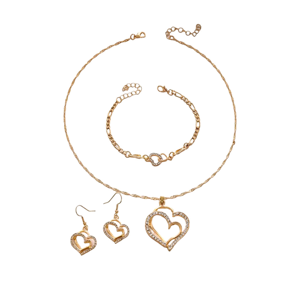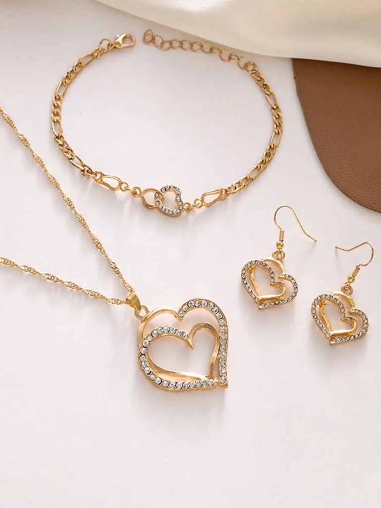 A szett minden darabja tökéletes összhangban van egymással: a nyaklánc kecsesen simul a nyakra, a karkötő diszkréten kiegészíti, a fülbevalók pedig elegáns keretet adnak az arcnak. Ideális választás romantikus alkalmakra, ünnepekre vagy ajándékként, amellyel különleges üzenetet közvetíthetsz. A dupla szív forma nem csupán dísz, hanem a szeretet és a kapcsolat örök jelképe, amely bármely megjelenést ragyogóvá és emlékezetessé tesz.