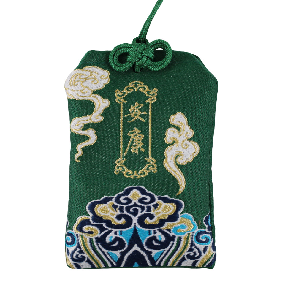 Az Egészség és jólét talizmán egy elegáns, sötétzöld színű amulett, amelyet egyedi, hímzett minták díszítenek. A motívumok a hagyományos keleti művészetet idézik, hullámzó felhőket és gazdag, aranyszínű szegélyeket ábrázolnak. A talizmán közepén látható írásjelek, az "Ankang" (安康), a nyugalom, az egészség és a jólét üzenetét hordozzák.