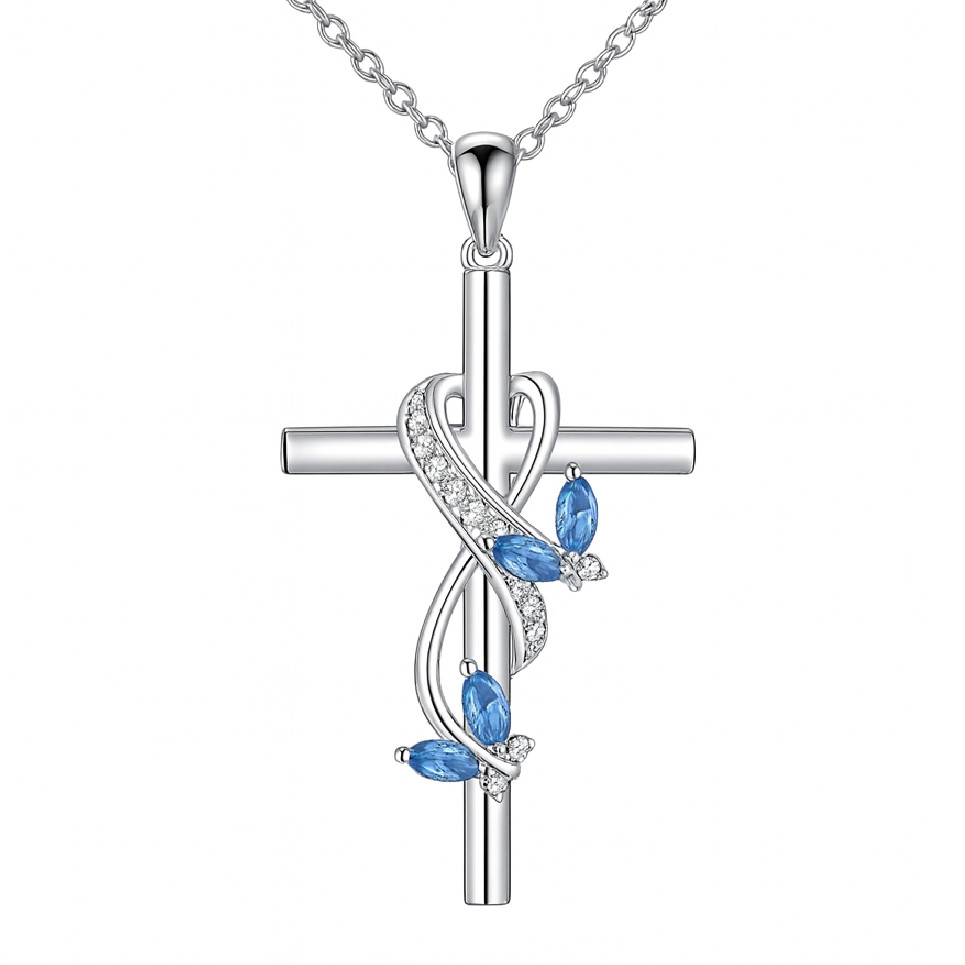 A kék köves kereszt medálos nyaklánc a hit és a nyugalom szimbolikus találkozása. Az ezüst tónusú kereszt letisztult, modern formája finoman ötvöződik a hullámvonalban futó díszítéssel, amelyet ragyogó fehér kristályok és mélykék kövek ékesítenek. A kék árnyalat a béke, a bizalom és a lelki egyensúly színe, így a nyaklánc viselője magában hordozhatja a belső harmónia és a tisztaság energiáját.