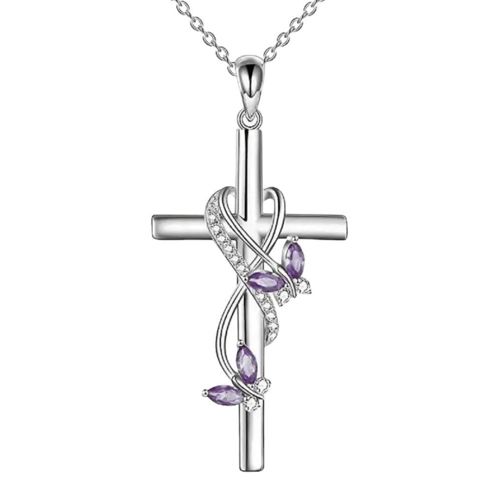 A lila köves kereszt medálos nyaklánc a spiritualitás, a méltóság és a belső erő megtestesítője. Az ezüst tónusú kereszt formát finoman ívelt díszítés öleli körül, amelyet apró, ragyogó kristályok és lila színű kövek díszítenek. A lila árnyalat a bölcsesség és a lelki harmónia színe, így ez az ékszer nemcsak látványában különleges, hanem mélyebb jelentéssel is bír. A kristályok fénye lágyan tükröződik a bőrön, elegáns és nyugodt kisugárzást kölcsönözve viselőjének.