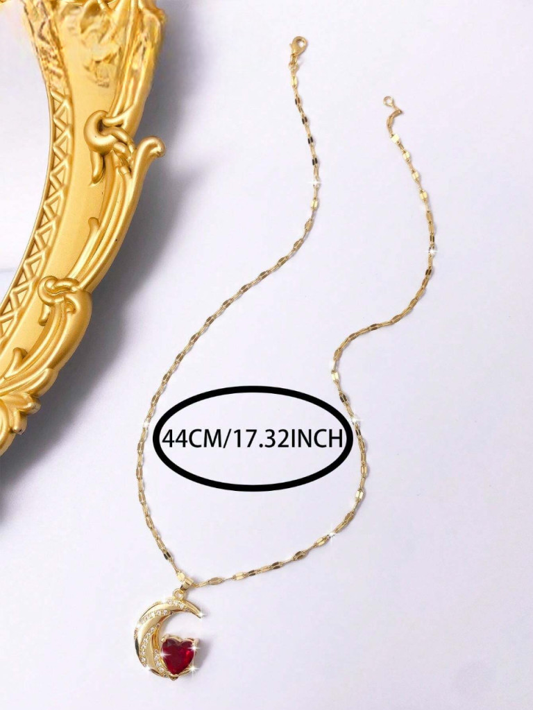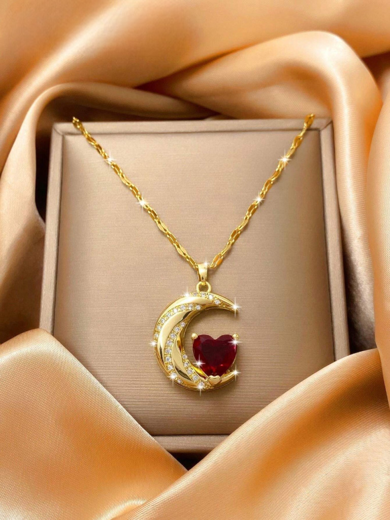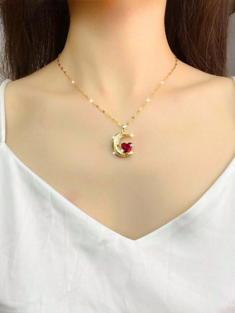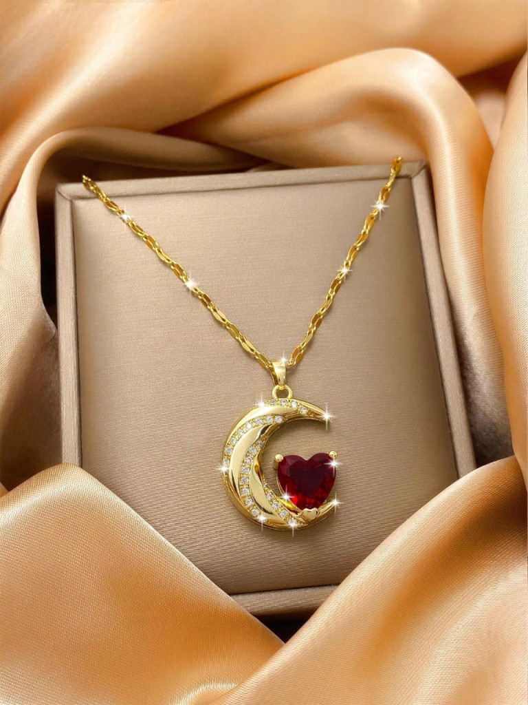 Ez a kifinomult nyaklánc a szerelem és a szenvedély szimbólumát hordozza magában, amely elegáns holdformájú medállal készült. A medál közepén egy ragyogó piros szívkő található, amely az érzelmek erejét és a romantikus kötődést fejezi ki. A félholdat apró, csillogó kristályok díszítik, amelyek finoman megtörik a fényt, így a nyaklánc különleges ragyogást kölcsönöz viselőjének.