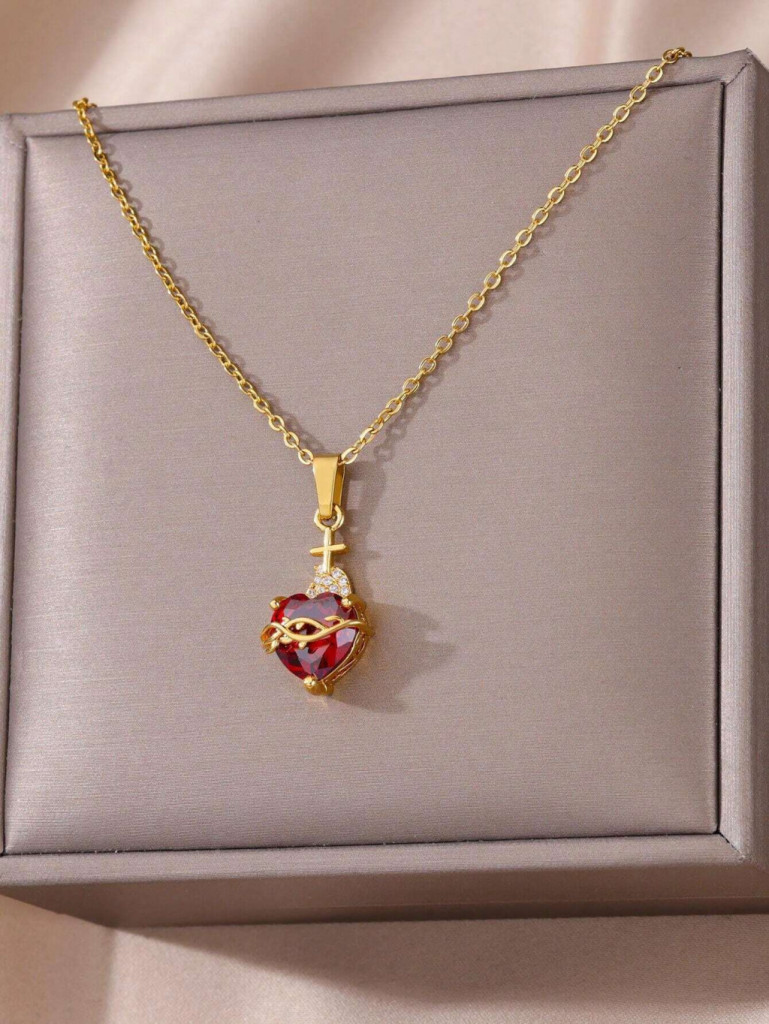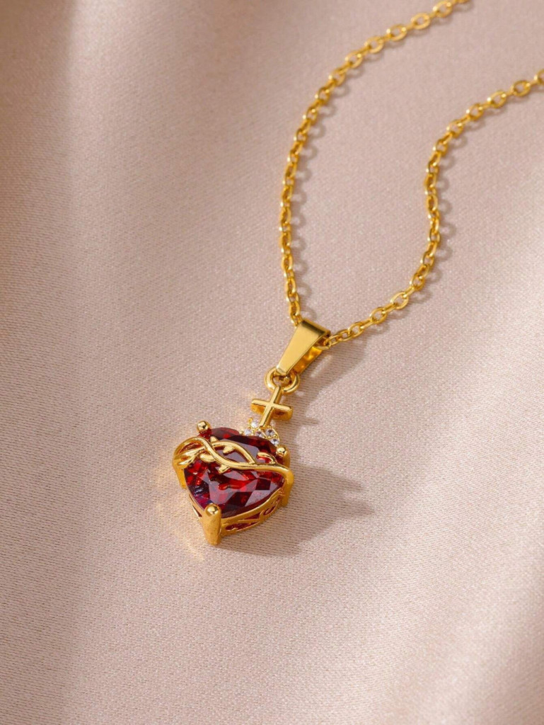 Ez a gyönyörű, aranyozott nyaklánc Jézus Szent Szívének szimbólumát jeleníti meg egy mélyvörös, szív alakú cirkónia kristály formájában. A szív körül futó finom arany indák az isteni szeretetet és a hit erejét fejezik ki, míg a medál tetején található apró kereszt a vallási jelentést erősíti. Ez az ékszer nem csupán elegáns kiegészítő, hanem egyben hitvallás és szeretetteljes üzenet is, amely különleges jelentőséget hordoz viselője számára.