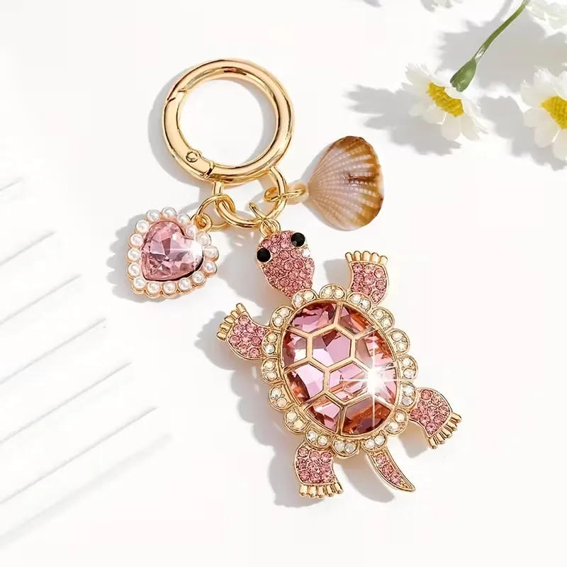 A rózsaszín teknősös kulcstartó bájos, mégis elegáns kiegészítő, amely a harmóniát és a szerencsét szimbolizálja. A részletgazdag kidolgozású teknős forma aranyszínű fémvázzal és finoman csillogó kristályokkal díszített, melyek minden mozdulatra fénytöréssel válaszolnak. A rózsaszín árnyalat melegséget és nőiességet sugároz, miközben a kis szívmedál játékos kontrasztot ad a kompozíciónak. Könnyű, mégis tartós kialakítása miatt ideális választás mindennapi használatra vagy különleges alkalmakhoz, legyen szó táskáról, kulcsról vagy ajándékról.