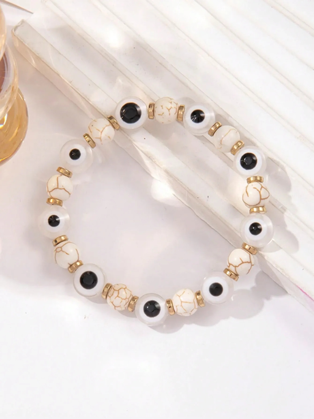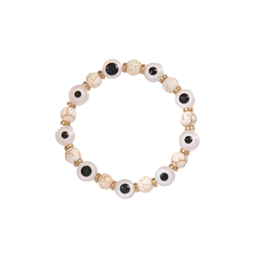 Ez a Szerencse és védelem karkötő a stílus és a hagyomány különleges ötvözete, mely egyedi megjelenésével azonnal magával ragad. A karkötőt váltakozó, világos, márványos mintázatú gyöngyök és feltűnő, sötét magos Nazar szem gyöngyök alkotják. A Nazar szem, amely a hagyomány szerint megóv a negatív energiáktól és szerencsét hoz, nemcsak dekoratív elem, hanem erős szimbolikus jelentéssel is bír. A gyöngyök közötti apró, arany színű távtartók eleganciát és kifinomultságot kölcsönöznek az ékszernek.