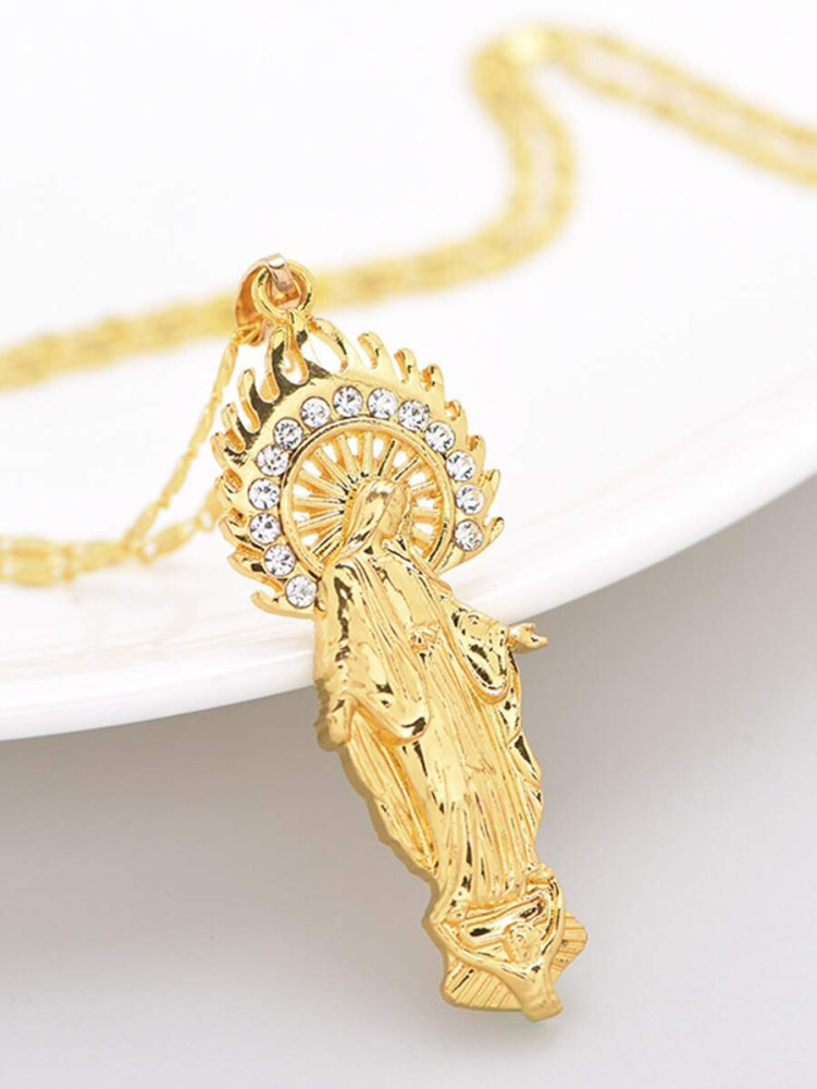 Ez a gyönyörű Szűz Mária nyaklánc nem csupán egy ékszer, hanem a hit, a tisztaság és a spirituális oltalom szimbóluma. Az aranyozott medálon látható láng minta a szentséget és a fényt jelképezi, emlékeztetve viselőjét a hit fontosságára és a Szűzanya védelmező szeretetére. A gondosan kidolgozott részletek időtlen eleganciát kölcsönöznek, miközben a vallási hagyományokhoz való hűséget is kifejezik.