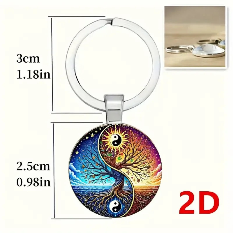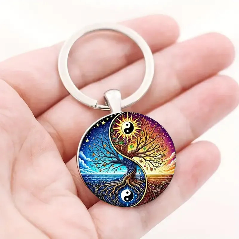 A Yin Yang életfa kulcstartó a belső egyensúly, a harmónia és az életenergia szimbóluma, a két ősi jelkép, a Yin Yang és az életfa egyedi módon fonódik össze, utalva a természeti erők és az ellentétek harmónikus kapcsolatára, a színes, részletgazdag kidolgozás egy igazi műalkotás.