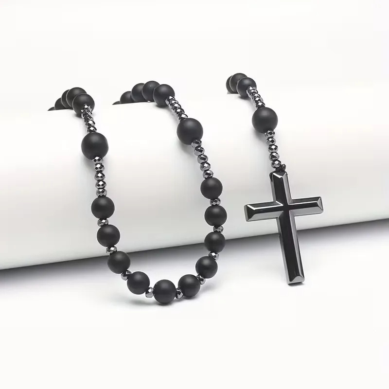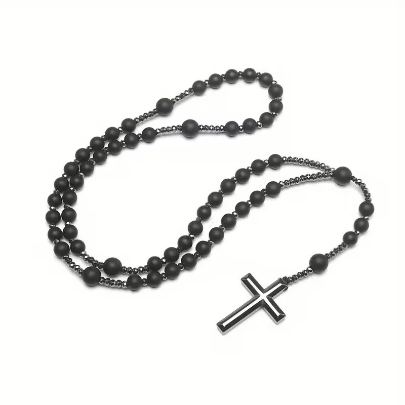 A rózsafüzér matt fekete gyöngyei visszafogott, mégis erőteljes megjelenést adnak ennek az időtálló ékszernek. A mély fekete árnyalat a belső erőt, a csendes összeszedettséget és a stabilitást jelképezi, miközben a klasszikus kereszt medál spirituális jelentéssel tölti meg a viselését. Letisztult formavilága miatt mindennapi használatra és különleges alkalmakra is ideális.